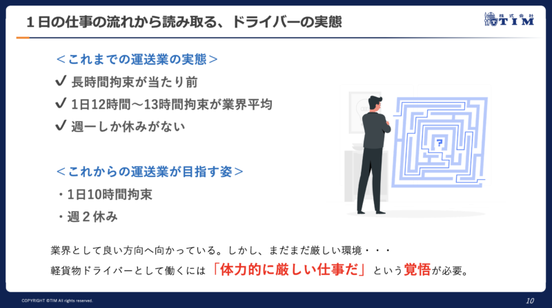 TIMに所属するドライバーさんも、約8割の方が1日12〜13時間程度拘束される仕事についています。